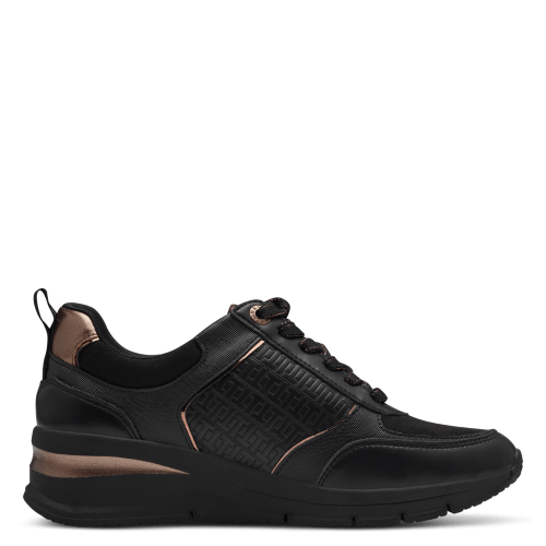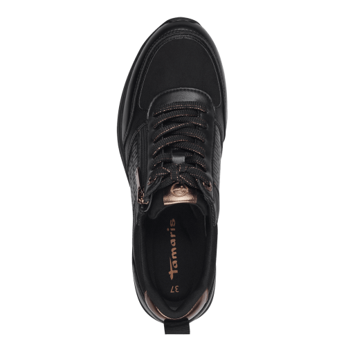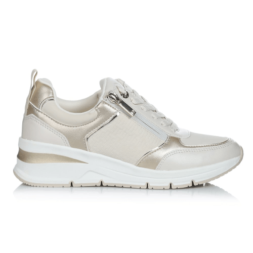 Γυναικεία sneakers Tamaris δετά και με φερμουάρ για σταθερό κράτημα στο βάδισμα και εύκολη εφαρμογή σε υπέροχο εκρού αλλά και μαύρο χρώμα και χρυσές λεπτομέρειες για αμέτρητους συνδυασμούς. Ιδανικά για περιπάτους ή πολύωρη ορθοστασία. Συνδυάζεται άψογα με σπορ ρούχα για τις βόλτες σας με άνεση και στυλ.